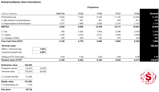 This results in a terminal value of $165.2B. When discounted to present value, the enterprise value is $142.5B. After subtracting net debt of $21B, the equity value comes to $121.5B, leading to a fair share price of $107.52.