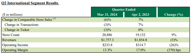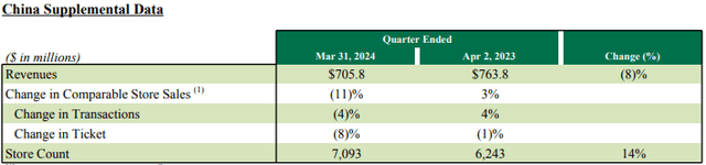 In the U.S., same-store sales decreased by 3%, while international sales fell by 6%. China, a key market for Starbucks, saw an 11% decline due to an 8% drop in the average amount spent per visit. Meanwhile, the average ticket sale dropped by 3% internationally and by a whopping 8% in China - this is, simply put, really bad.