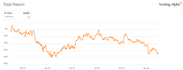 - Starbucks stock has declined by almost 35% in the last three years, despite growing revenues.