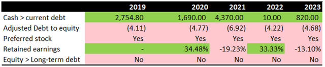 Let's move on to the balance sheet. In the table below, we have different debt and equity metrics. The amount of cash to current debt significantly decreased from $2.75B in 2019 to just $820M in 2023, which is very worrisome.
