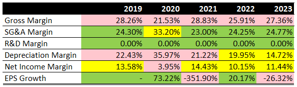 Notably, the net income margin has been declining, from 13.58% in 2019 to 11.44% in 2023, which is not necessarily bad. It just isn’t great either.