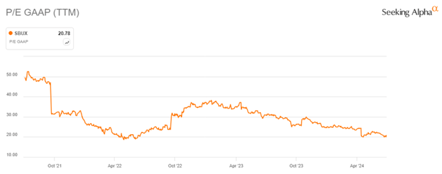 Plenty of reasons can explain why that is, which we will also discuss in this article, but there might also be a certain degree of value hidden in this stock. One sign of potential value can also be seen in Starbucks’ current P/E (in TTM), which is currently around the lowest level in the past three years.