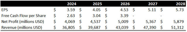Net profit is projected to rise from $4.07B in 2024 to $5.88B in 2028, while revenue is expected to grow from $36.8B to $51.3B over the same period.