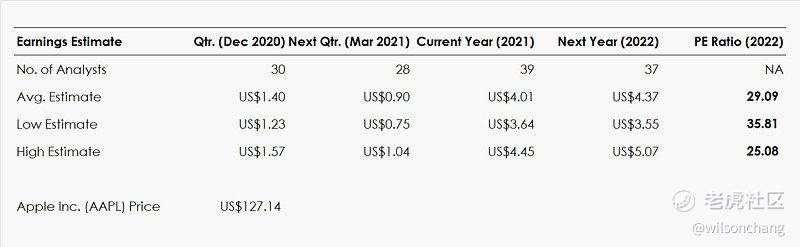 取當前市面上所有的分析師對2022年EPS的預估,當前127美元的股價,對應22年EPS後市盈率爲29.09倍,而30倍的蘋果在歷史上,這個估值已經偏高。