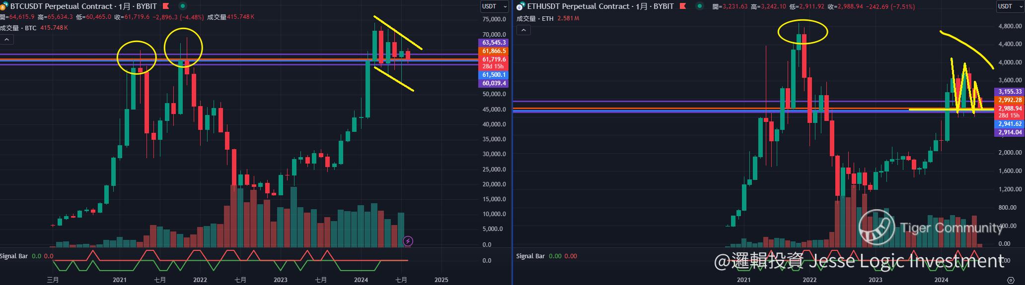 比特幣在突破高位後,看似在整固,但連上高低點時便可以察覺其趨勢是微微下跌的。而以太幣隱約形成的下跌三角形走勢同樣展示了空頭的強勢。