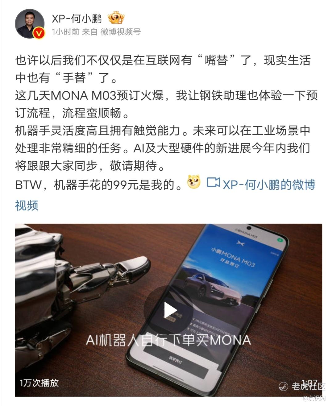 8月12日,何小鵬在微博上發佈了一則通過AI機器人操作下訂MONA M03的視頻,視頻中機器手部動作十分擬人化。何小鵬表示,機器手靈活度高且擁有觸覺能力,未來可以在工業場景中處理非常精細的任務。小鵬的AI及大型硬件的新進展在今年內將跟大家同步。