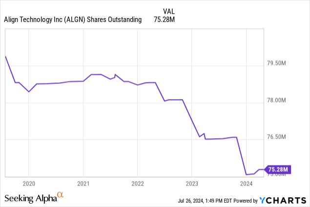 Align has a stellar balance sheet, which mitigates potential risks in case of a recession. In addition, Align has been decreasing its shares outstanding, which could add fuel to the fire once the company starts moving in the right direction.