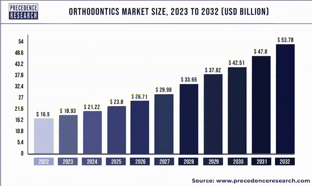 Last but not least, the visual below shows the expected orthodontics market size. This projection foresees quite a nice growth for the orthodontics market, with a CAGR of 12.3% per year from 2022 to 2032.