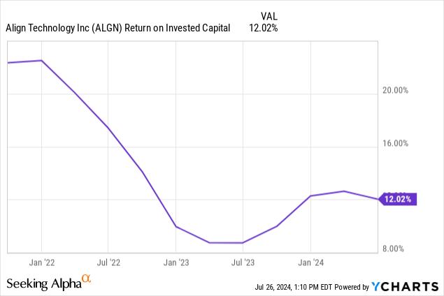 ROIC: A good measurement for the quality of a company is the ROIC. I think for a company like Align, a ROIC number above or around 20% should be the goal. This is also what the management indicated a few years ago as the long-term goal. As of today, the ROIC of Align Technology is just 9.40% according to my own calculations and Guru Focus. According to YCharts, Align's ROIC is 12.02%, while this is better, it still isn't the 20% we would like to see.