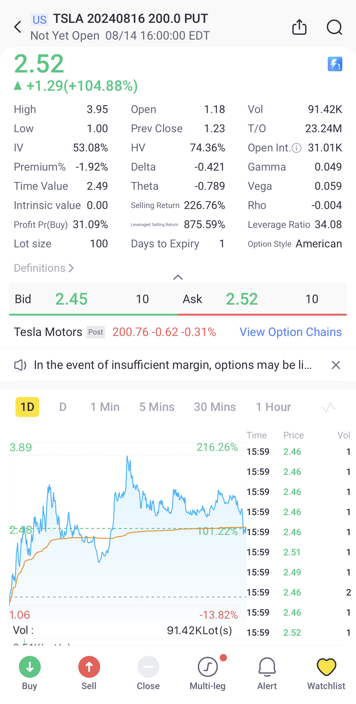 There are 1.24M Tesla option contracts traded on Wednesday. Call options account for 58% of overall option trades. Particularly high volume was seen for the $200 strike put option expiring August 16, with 91,416 contracts trading. The $200 strike put option expiring this Friday surged 105% on Wednesday. $TSLA 20240816 200.0 PUT$