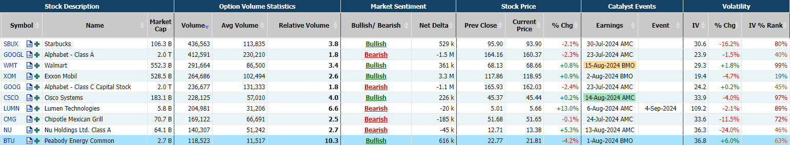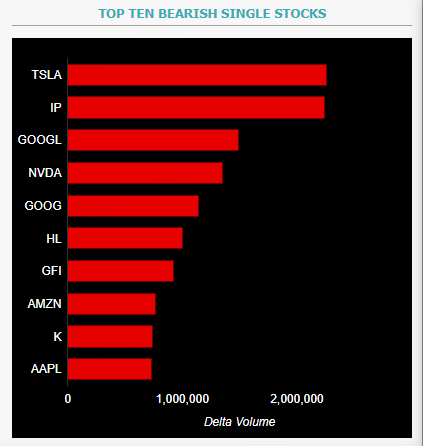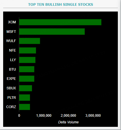 This report shows stocks with the highest volume of bullish and bearish activity by option delta volume, which converts option volume to an equivalent stock volume (bought or sold).