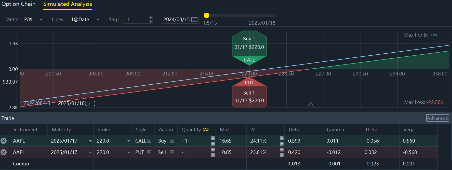 Apple is currently trading at $222, and if you believe the price will go up, you might consider buying a call option with a $222 strike price expiring on January 17, 2025, while selling a put option with the same strike price and expiration date.