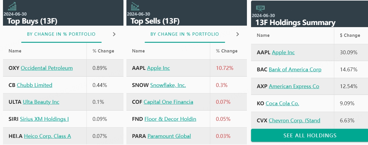 On August 14, 2024, $Berkshire Hathaway(BRK.A)$ $Berkshire Hathaway(BRK.B)$ , led by Warren Buffett, filed its 13F with the SEC, revealing its latest portfolio changes for the previous quarter.