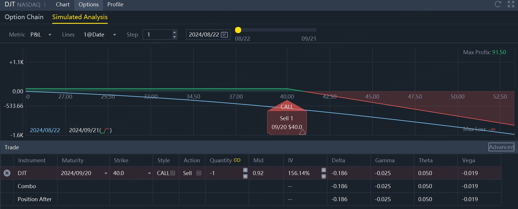 If we sell a call option with a strike price of $40, expiring on September 20, with a premium of $0.92. It means we believe DJT will not reach $40 by September 20.
