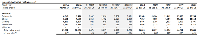 Adjusting our previous forecast for AMD’s actual 2Q24 results and forward outlook, we expect the company to grow revenue by 14% y/y to $25.8 billion in 2024. The updated estimates also reflect our continued confidence in an upcoming upgrade supercycle for AMD across the data center, client and embedded segments as discussed in our previous coverage.