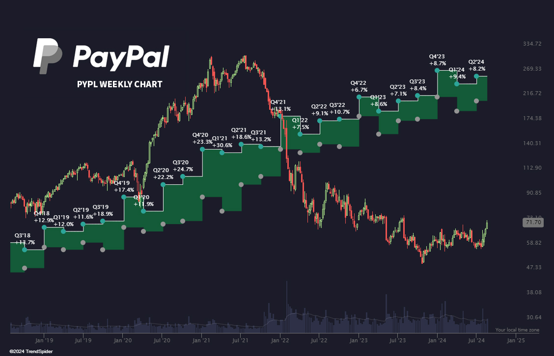$PayPal(PYPL)$ Weekly Chart vs. Quarterly Revenue