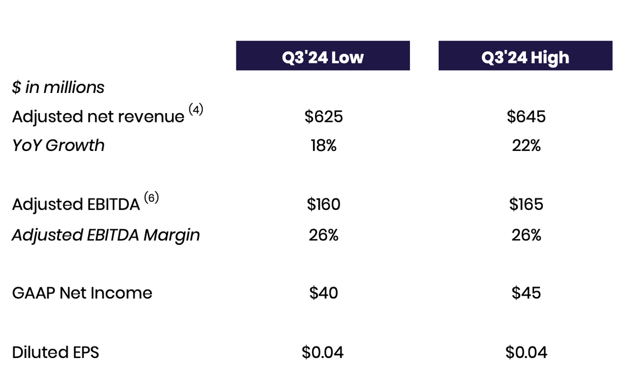 SoFi expects adjusted net revenue to be between $625 million and $645 million in Q3 2024, with annual healthy growth of 18% to 22%. This shows SoFi's success in attracting new customers and improving services, while the narrow range conveys confidence in hitting the targets.