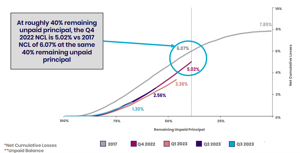 At about 40% remaining unpaid principal balance (UPB), SoFi has an NCL of 6.07%. In contrast, the Q4 2022 vintage had a lower NCL of 5.02% at the same UPB level. This reflects improved credit quality and risk management. Lower NCLs and increased loan originations show SoFi's tighter underwriting standards, with changes in credit cuts in mid-late 2022 evident.