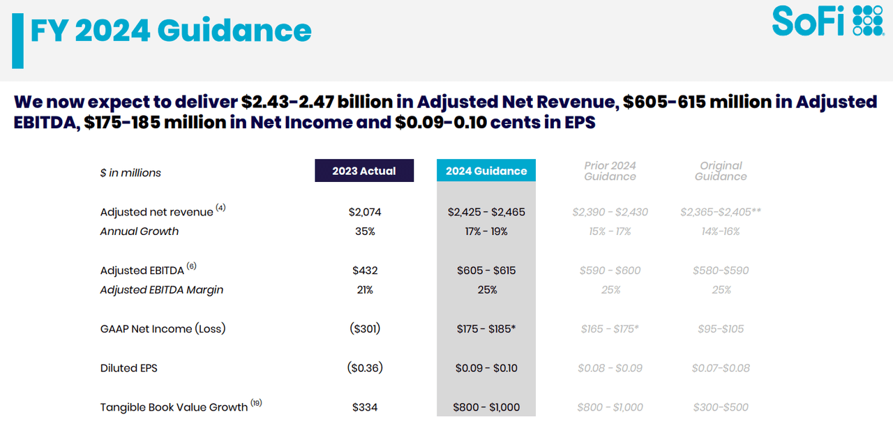Net income and EPS projections show significant improvements. GAAP Net Income is guided between $175 million and $185 million, a turnaround from the $301 million loss in 2023. Diluted EPS may rise to $0.09-$0.10, significantly improving from a $0.36 loss per share in 2023, highlighting SoFi's successful transition to profitability.