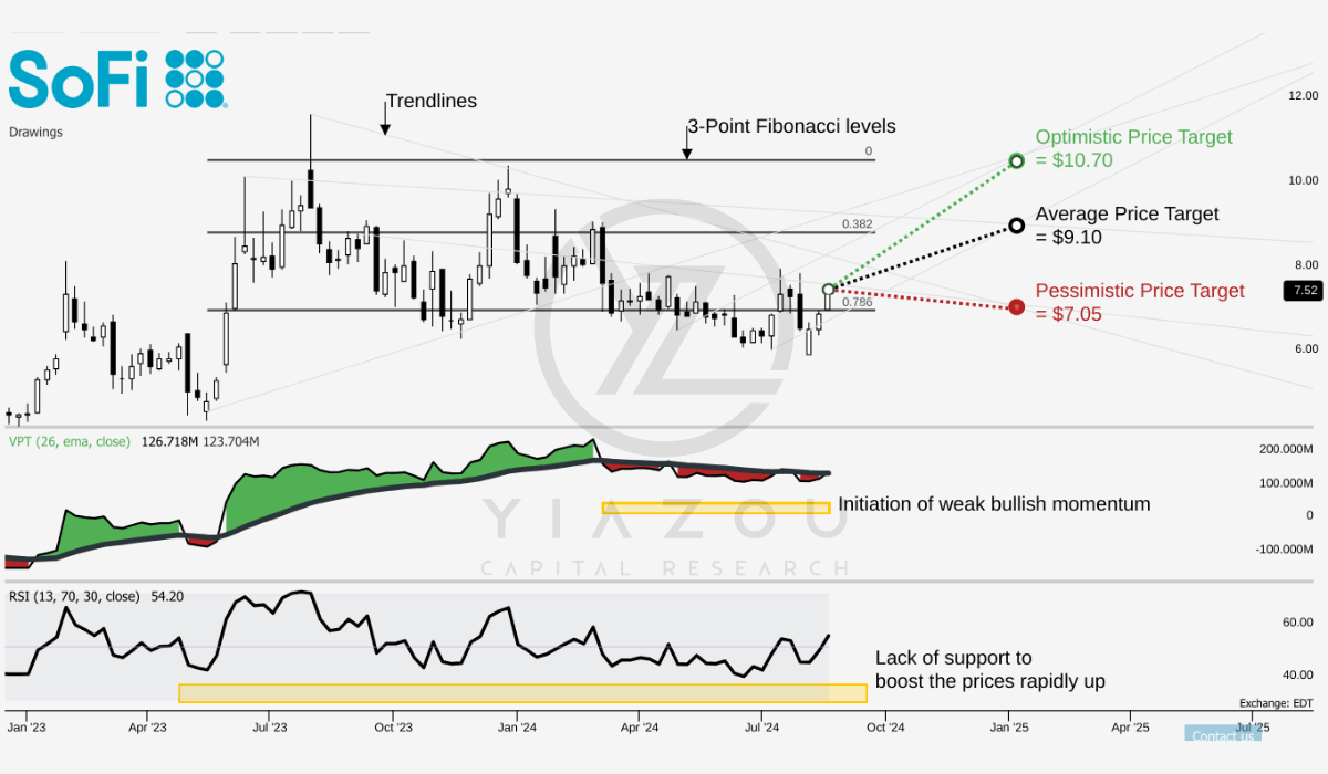 SoFi's stock trading at $7.50 places the stock in a critical range, closely aligned with the pessimistic price target of $7.05, corresponding to the 0.786 Fibonacci level. This alignment indicates that SoFi is hovering near a significant support level, suggesting a potential rebound if this support holds. The average price target of $9.10 and the optimistic target of $10.70 align with the 0.382 and 0 Fibonacci levels, respectively, signaling a potential upside if the stock can break through these resistance levels.