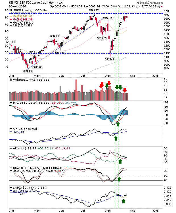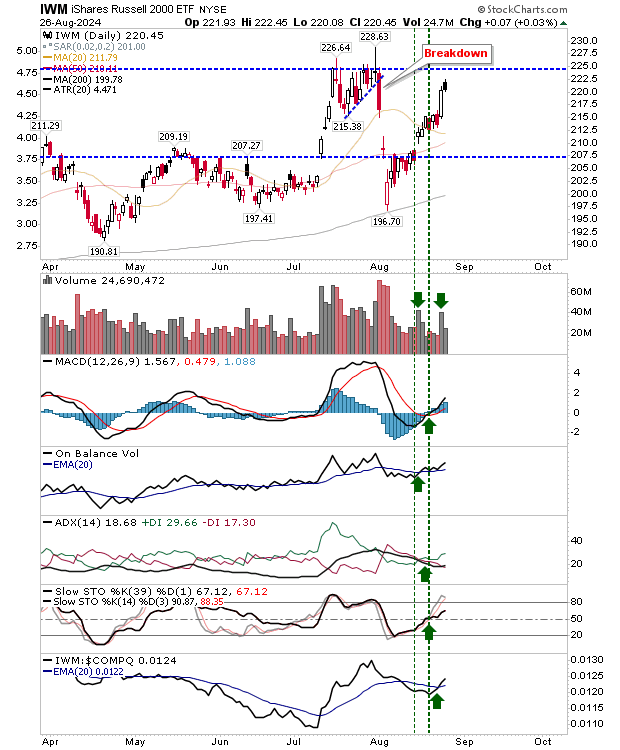 The $S&P 500(.SPX)$ is knocking around just below breakout resistance. Unlike the Russell 2000, recent volume has been tepid, but with prices holding gains without the price extension seen in the Russell 2000, suggests the index could hang on.
