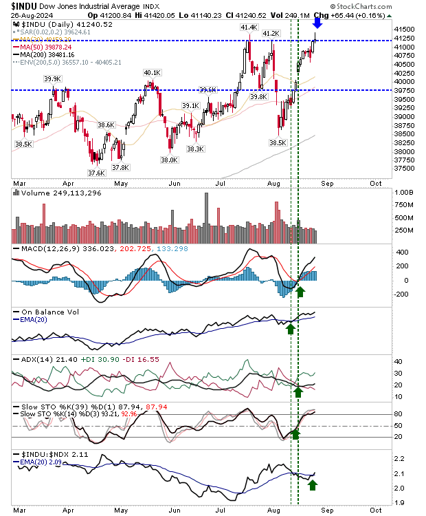 Since returning from holidays it has been a straight forward series of gains for markets. Monday's action had suggested a potential breakout, but it got pegged back by the close with the Dow finishing on an inverse hammer at resistance.