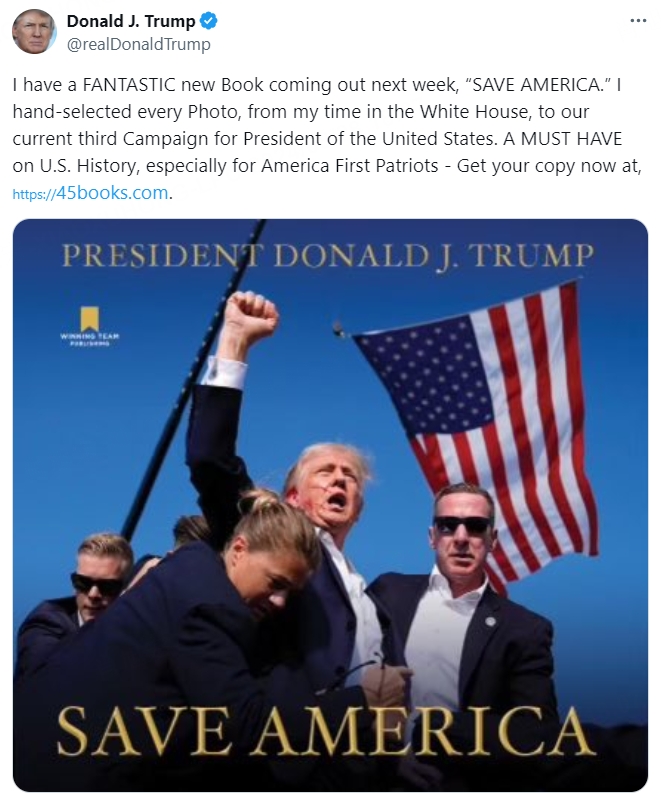 I have a FANTASTIC new Book coming out next week, “SAVE AMERICA.” —Donald J. Trump@realDonaldTrump