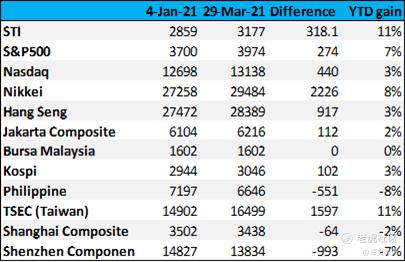 近來,新加坡海峽時報指數 (STI)是表現最佳的指數之一,目前接近 3,183點的歷史最高值。按年初迄今計算,STI是本區域業績最優的股指,與臺灣指數並列第一。