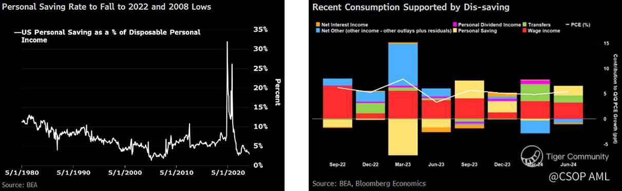 According to Bloomberg, it is noted that ~80% of households have used up excess savings accumulated during the Covid pandemic, meaning that there is a chance that households lack resilience to deal with negative shocks and consumption could slow if unemployment climbs as it has the past 4 months and if stock market rally loses momentum.
