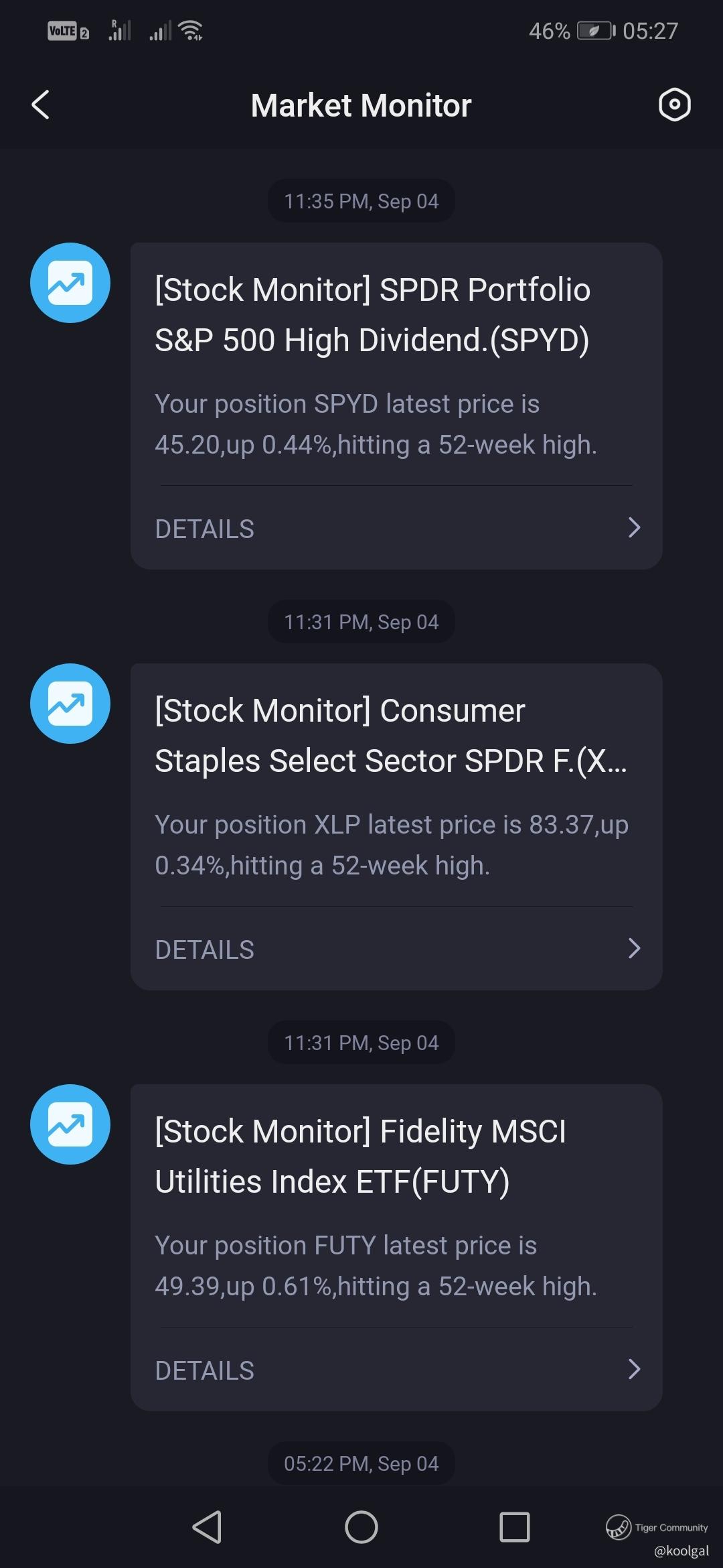 πππOn Tuesday the Volatility Index VIX spiked at least 30% to kickstart September on a wobbly note but fortunately it is not doom and gloom for my portfolio. I was notified by my Tiger App Market Monitor that 3 of my Defensive ETFs have just hit a 52 week high.