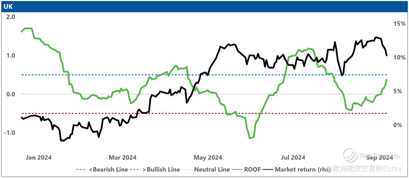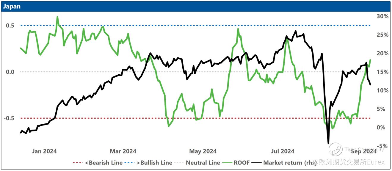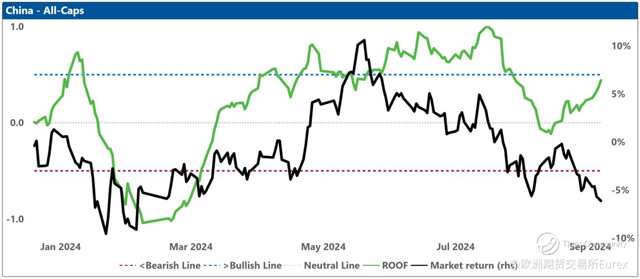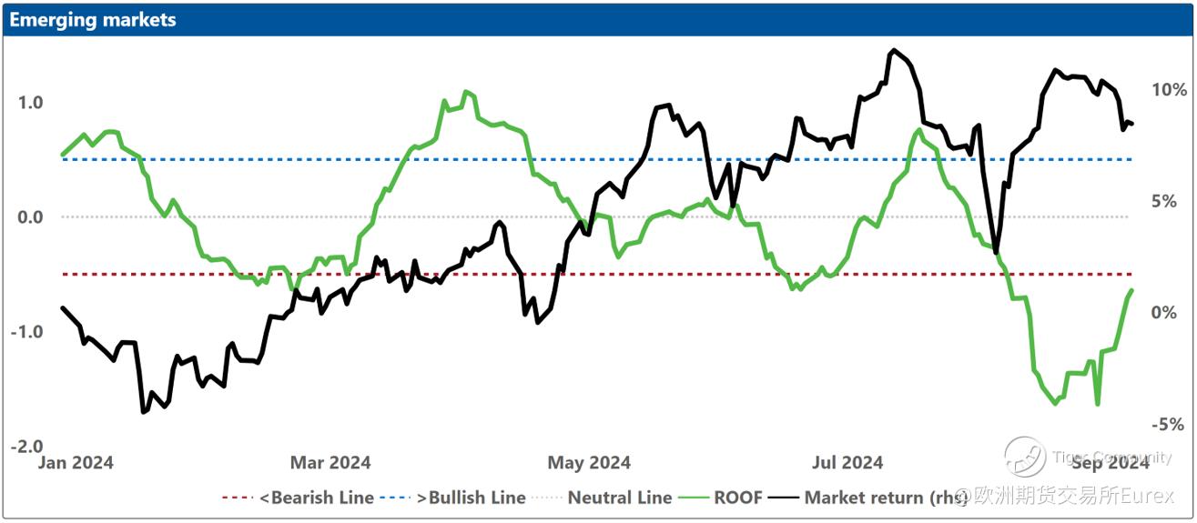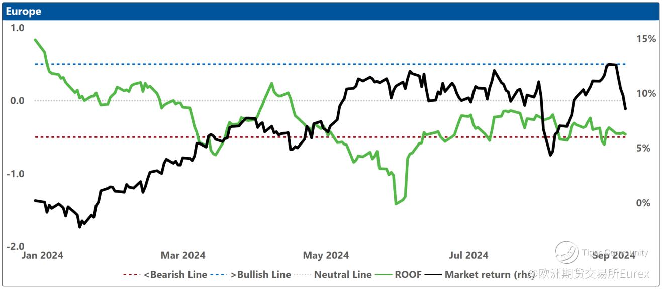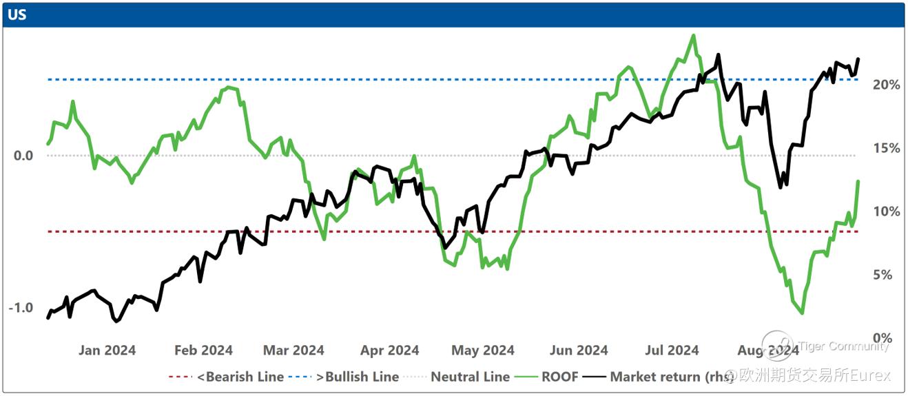 The top charts illustrate the ROOF ratio, which represents investor sentiment. This ratio is depicted in green on the left axis, while the cumulative returns of the underlying market are shown in black on the right axis. Key reference lines include: