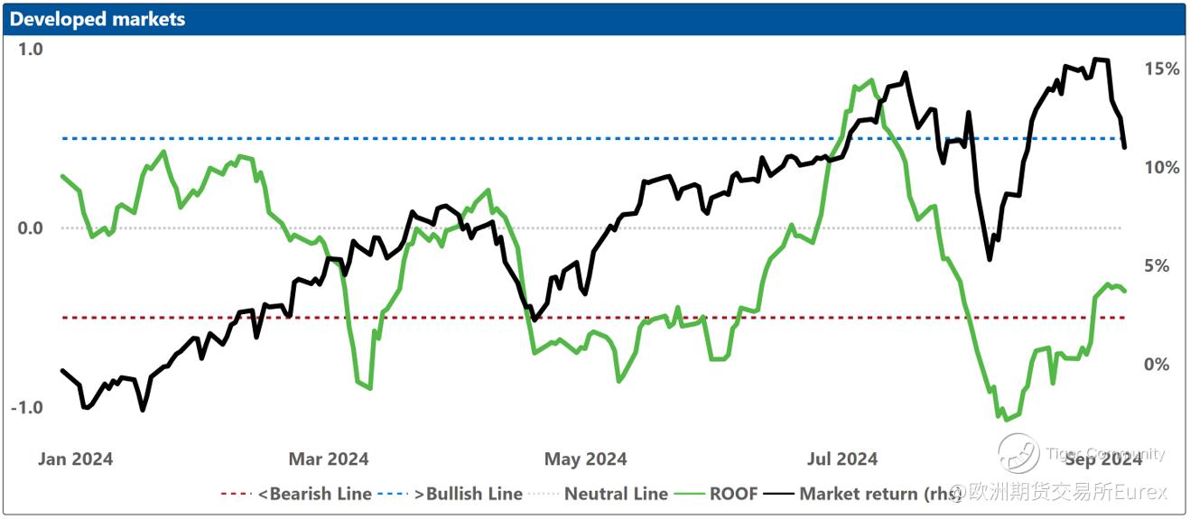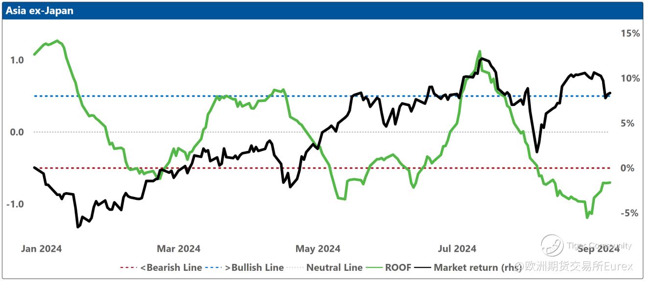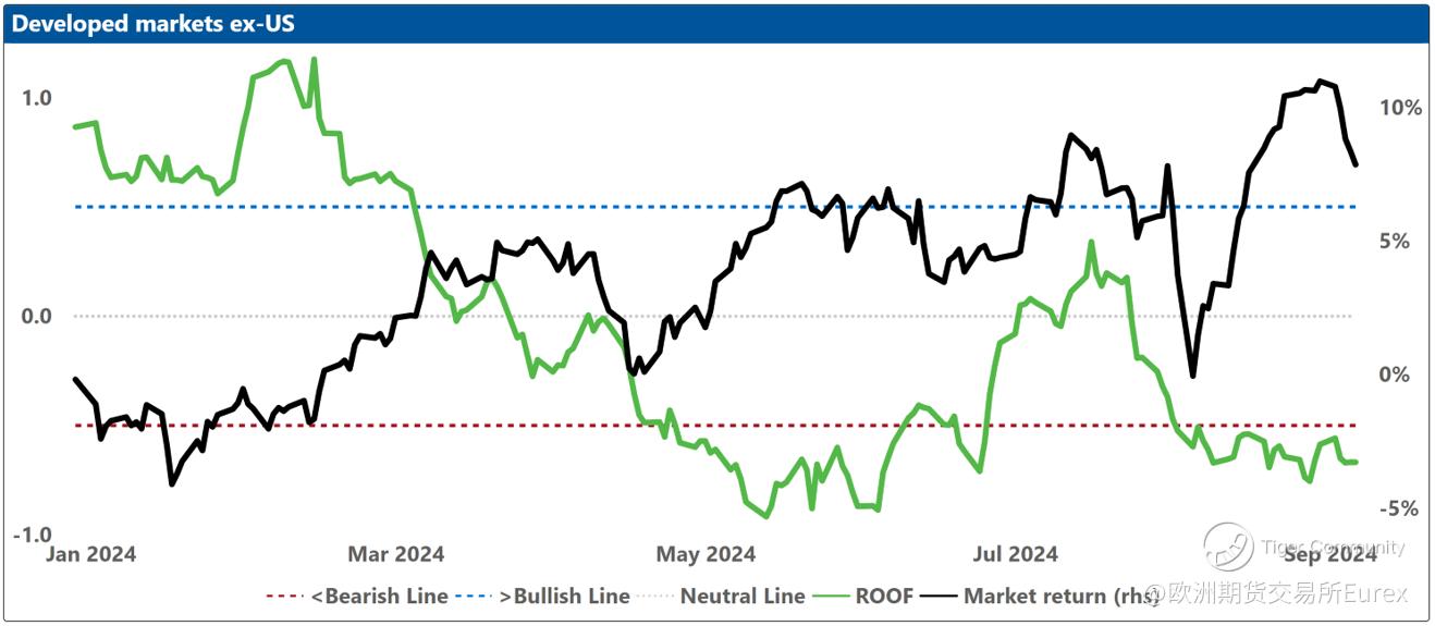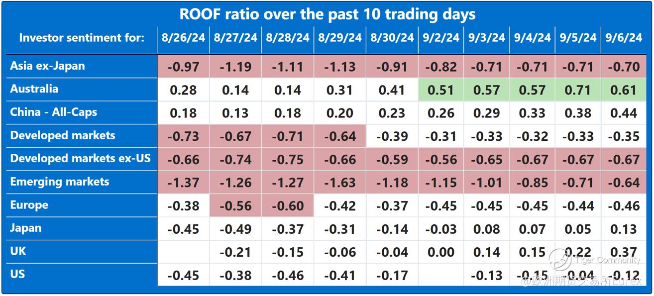 This week, investors’ mood remained largely stable, with a bearish outlook persisting in Asia excluding Japan, Global Developed excluding the US, and Global Emerging markets. Sentiment stayed negative in Global Developed markets and Europe, while Japan and the US maintained their neutral stance. The recently positive mood in China endured another week, while investors in Australia recovered their bullish feeling last seen in July. The large dispersion in investor sentiment across the world reflects the prevailing uncertainty, fueled by inconsistent economic indicators and a packed schedule of forthcoming events. These include crucial interest rate decisions from the ECB and the Fed, set to take place this month, amidst ongoing geopolitical tensions in Gaza and Ukraine, and a too-close-to-call US Presidential election race.