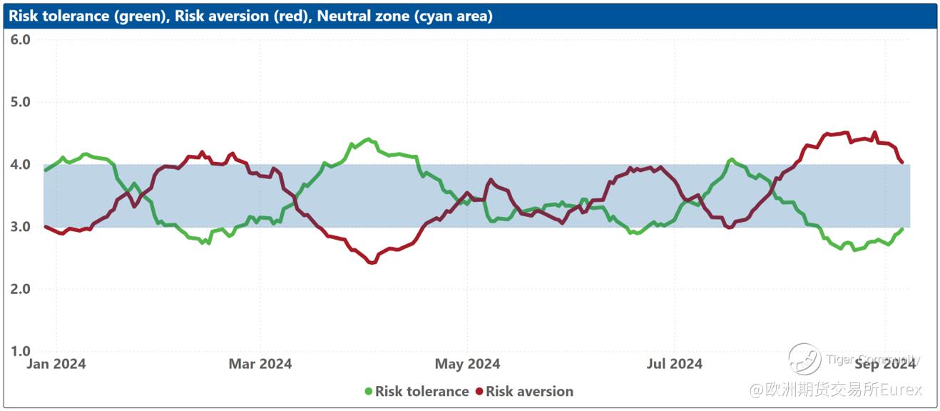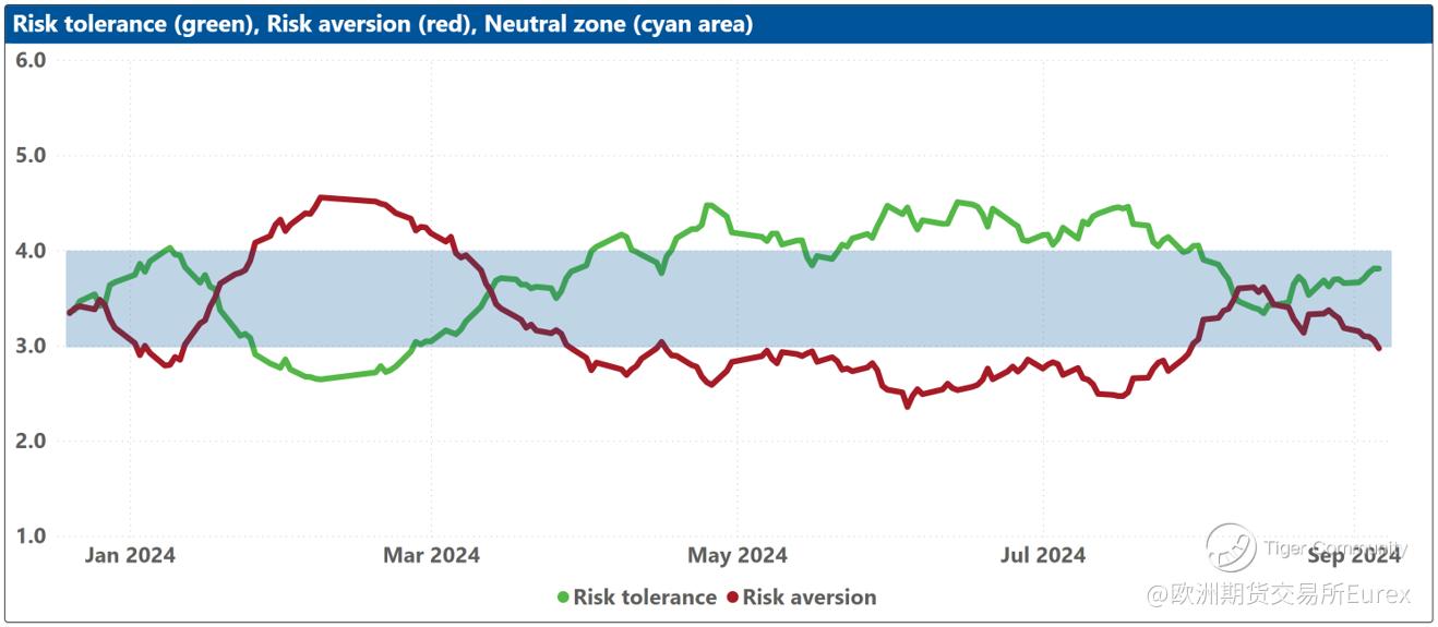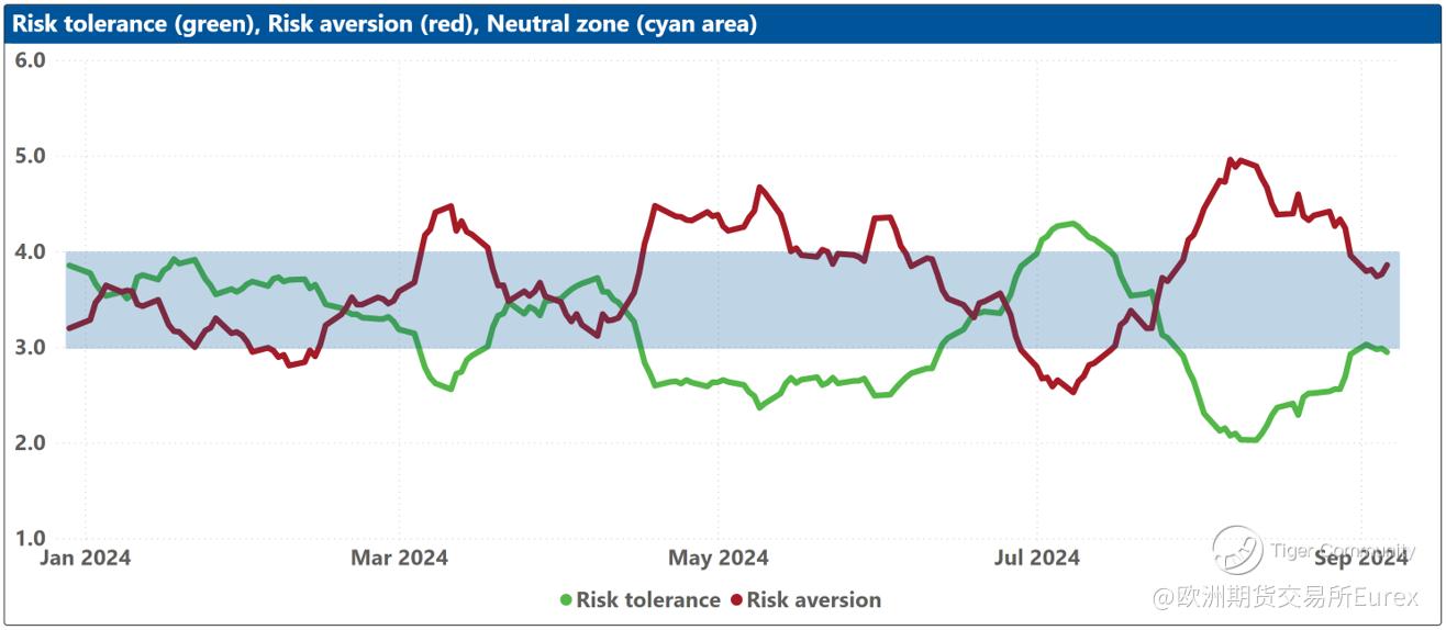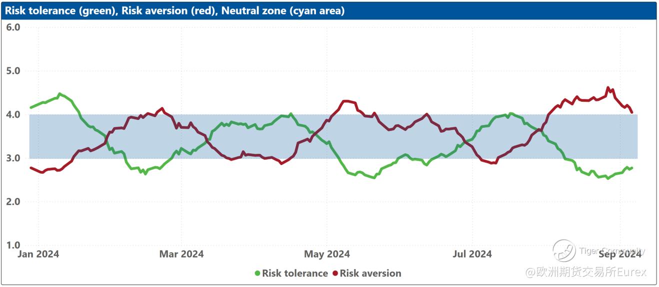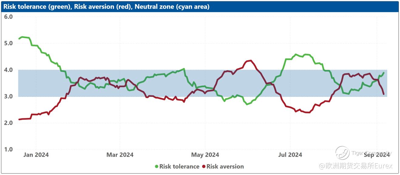 The bottom charts display the levels of risk tolerance (green line) and risk aversion (red line) within the market, representing investors' demand and supply for risk, respectively. Key insights include: