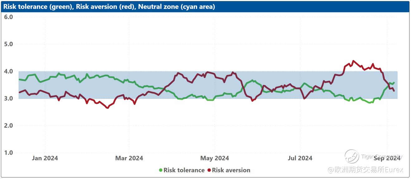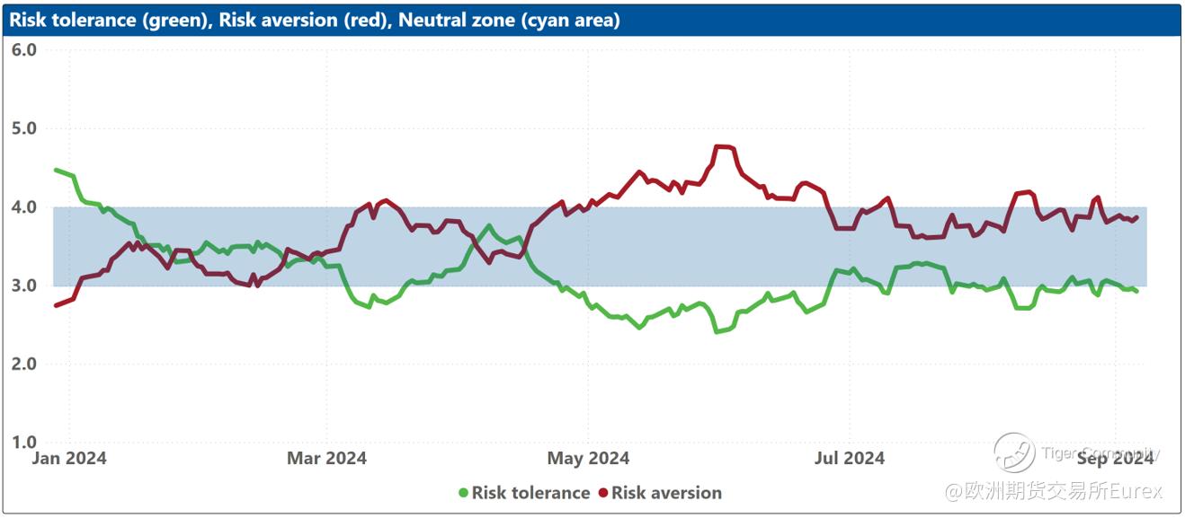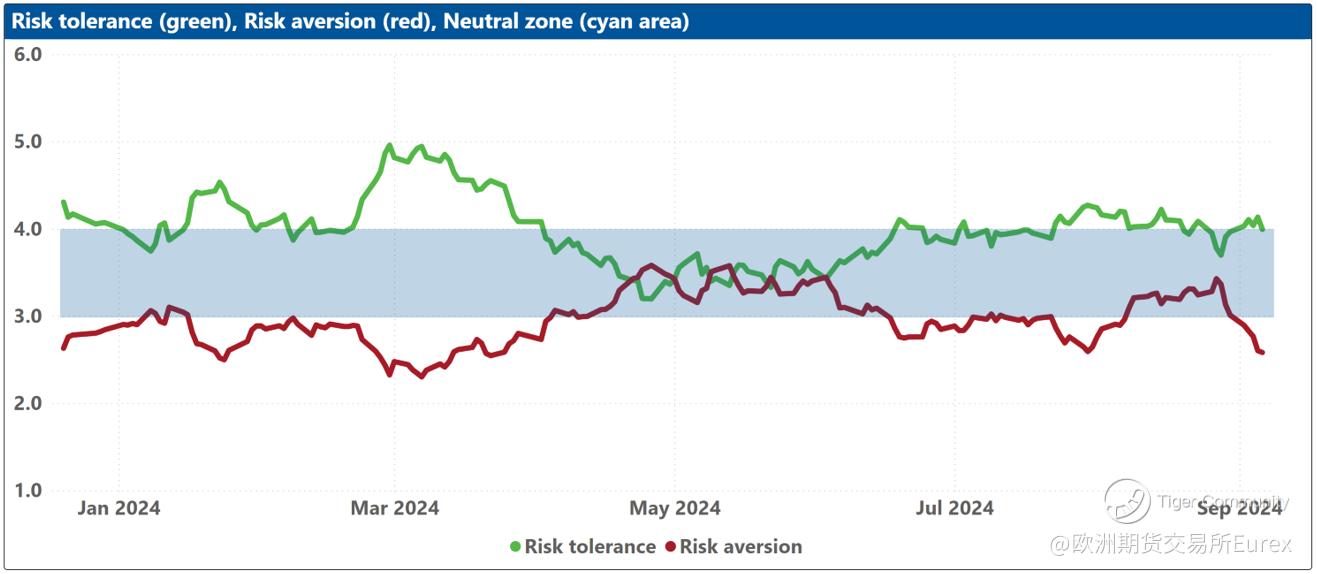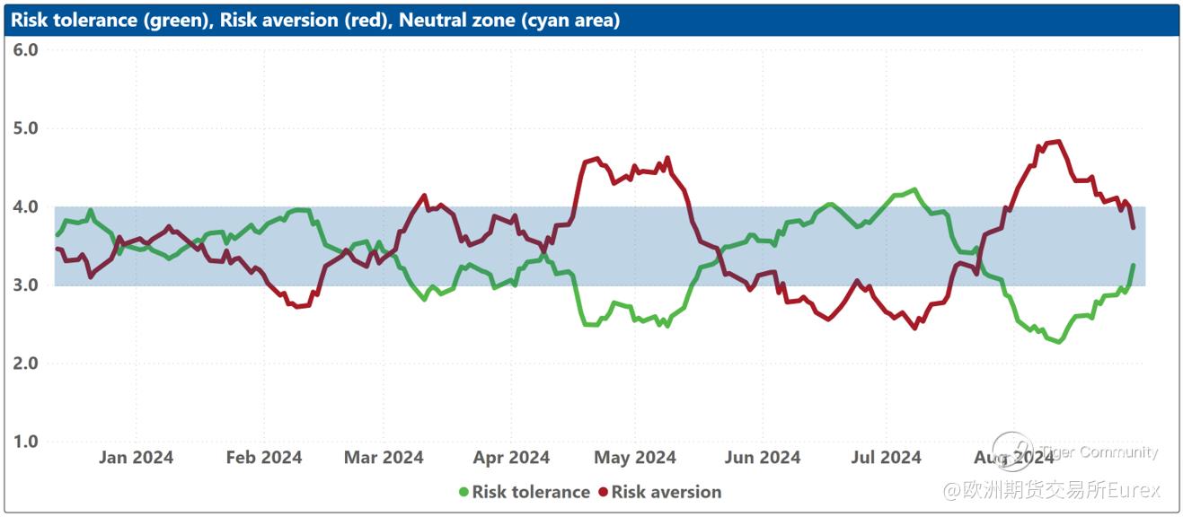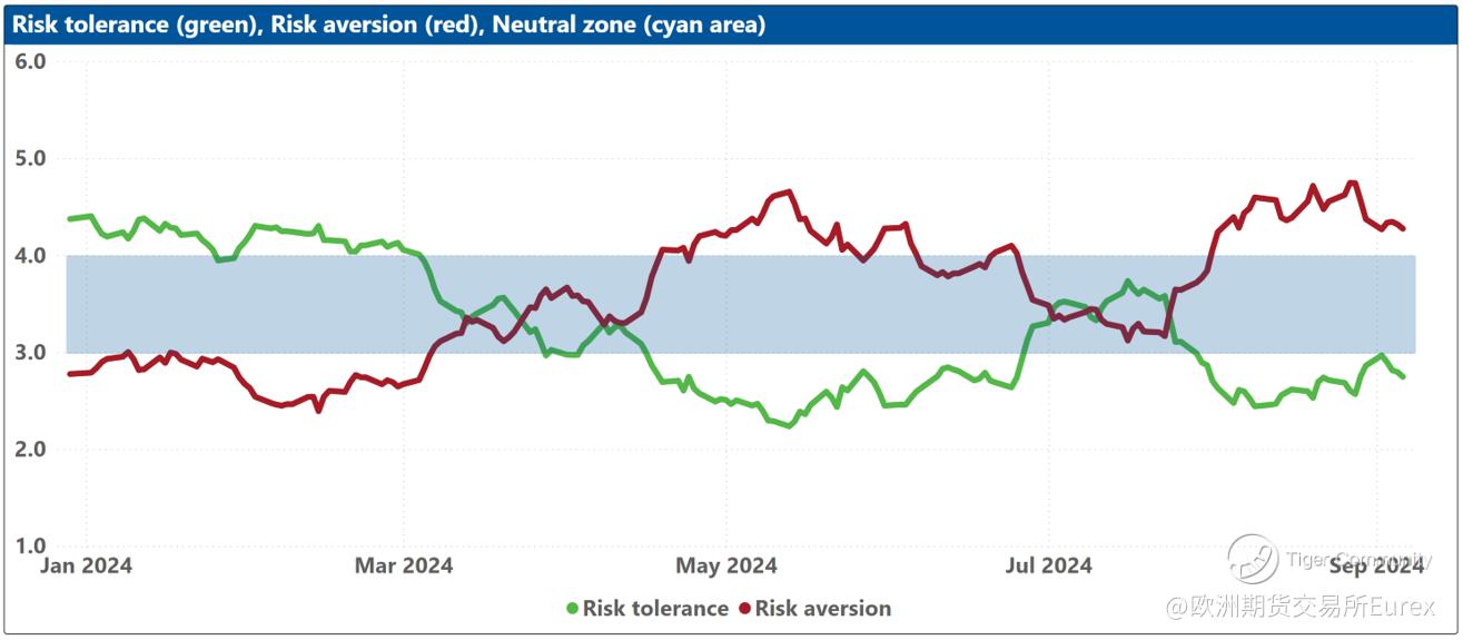 The bottom charts display the levels of risk tolerance (green line) and risk aversion (red line) within the market, representing investors' demand and supply for risk, respectively. Key insights include: