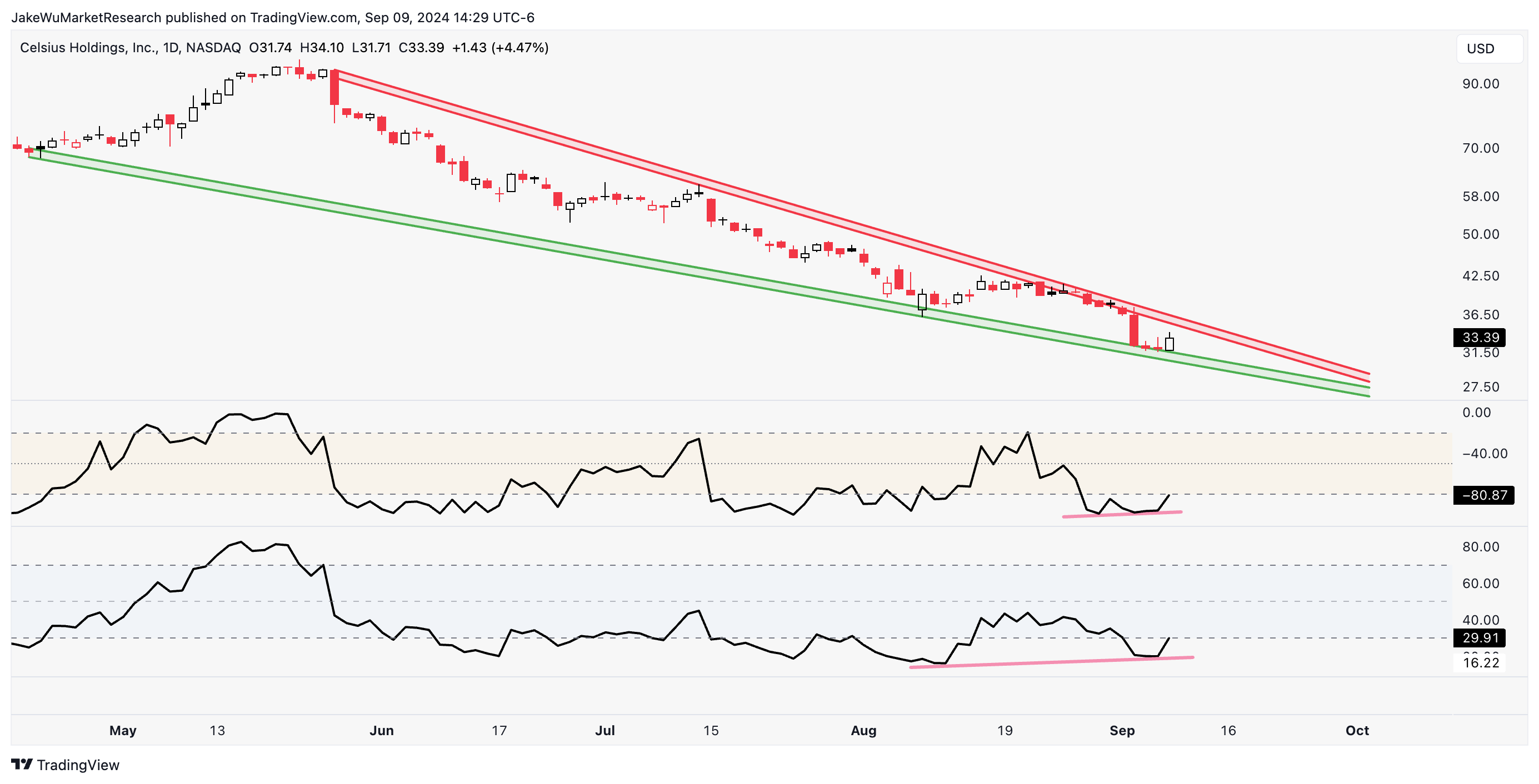 $Celsius Holdings, Inc.(CELH)$ Some RSI & Williams % Range positive divergence starting to print as price nears the apex of this falling wedge.