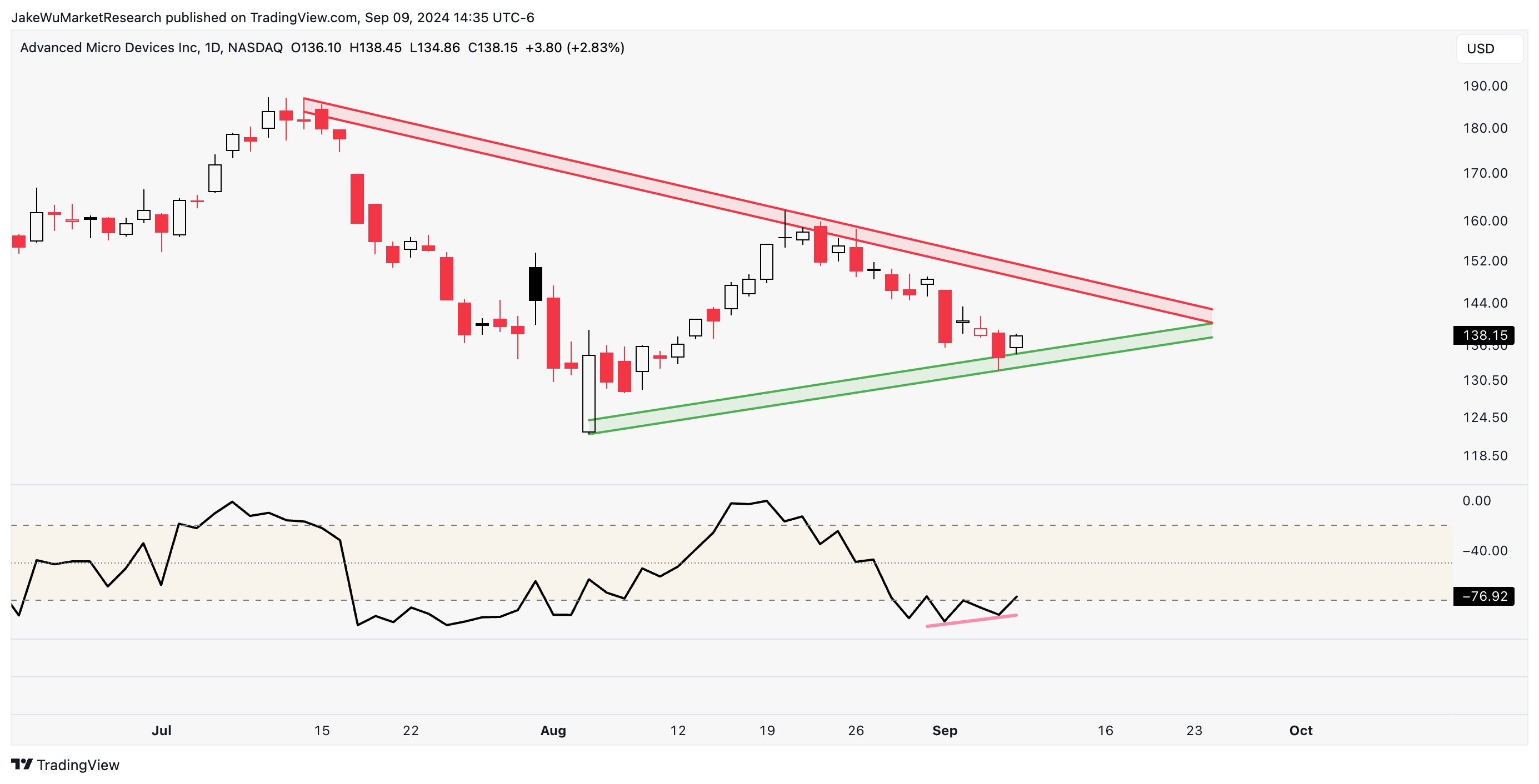 $Advanced Micro Devices(AMD)$ Early stages of a symmetrical triangle forming here as the Williams % Range prints divergence.