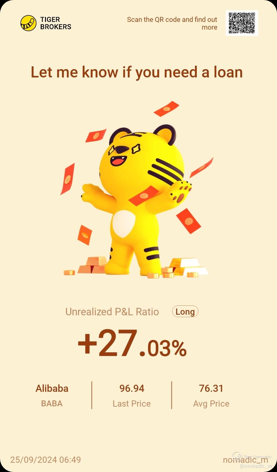 $Alibaba(BABA)$ Today marks a triumphant validation of my conviction in Alibaba. My unwavering commitment to holding this position has yielded substantial gains, as the stock surges in response to the interest rate cut and favorable market sentiment.