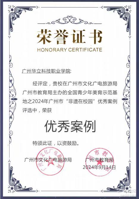 2024年度全國青少年美育示範基地之“非遺在校園”優秀案例展示活動由廣州市文化廣電旅遊局及廣州市教育局主辦,廣州市文化館(廣州市非物質文化遺產保護中心)及廣州市教育研究院共同承辦,旨在展示積極創新“文教融合”的非遺傳承模式,將“非遺在校園”系列活動常態化、品牌化,推動非遺項目在校園傳播的標準化、規範化、在地化,更好地促進非遺的傳承、傳播和可持續發展。通過前期申報、專家實地調研、專家評審等環結,共評選出20所“非遺在校園”優秀案例學校,以及1所特別邀請學校。其中,增城有3所學校入圍,華立職業學院廣州欖雕傳承案例位列其中。