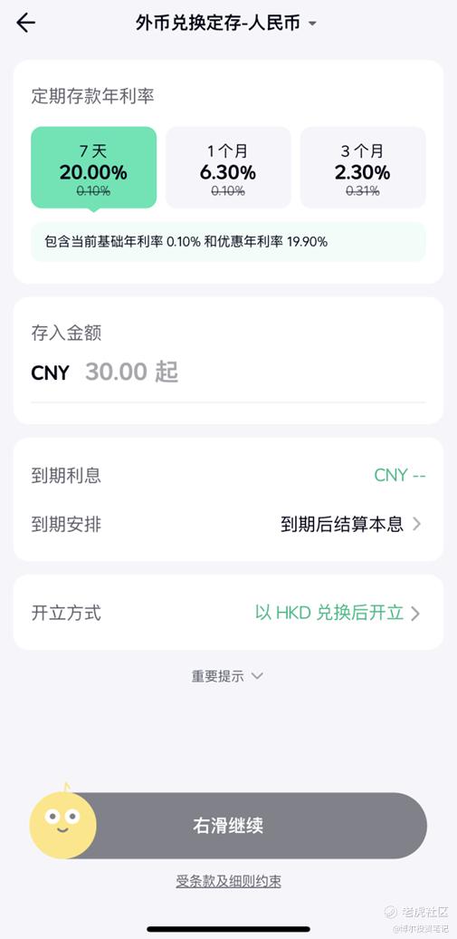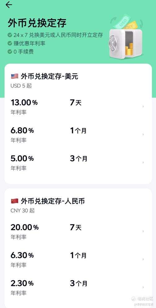 具體而言,用戶可將其他貨幣兌換成人民幣,轉入定存7天,定存利率按年化20%計算;若選擇兌換人民幣定存1個月,年化利率可達6.3%;定存3個月的年化利率則爲2.30%。此外,用戶還可以兌換美元進行定存,根據衆安銀行的活動介紹,用戶完成“兌換人民幣”和“兌換美金”的任務後,可獲得7天人民幣定存加息券和1個月美元定存加息券,結合基礎年利率,投資者能夠享受到18.1%的人民幣定存年利率和6.5%的美元定存年利率。