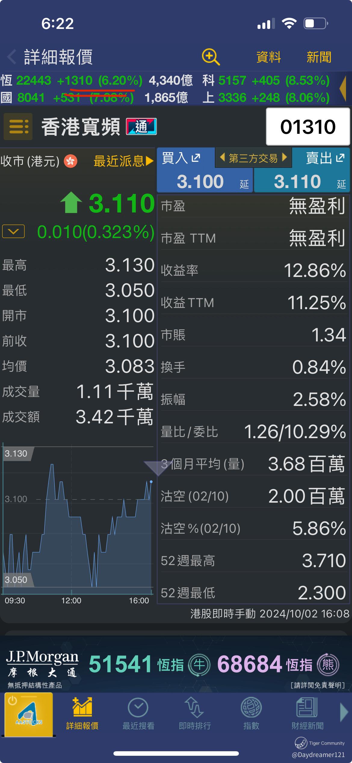 由於美國減息週期啟動 市場預計未來存款收息回報率下降 對高息股等高息類別資產需求大增 而香港寬頻股息率接近10% 雖然早期因公司投資政策失誤導致2023年錄得虧損 繼而令香港寬頻股價下滑 至今估值而到相當吸引既地步 今日恆生指數咁巖收報上升1310點 值得留意$香港寬頻(01310)$