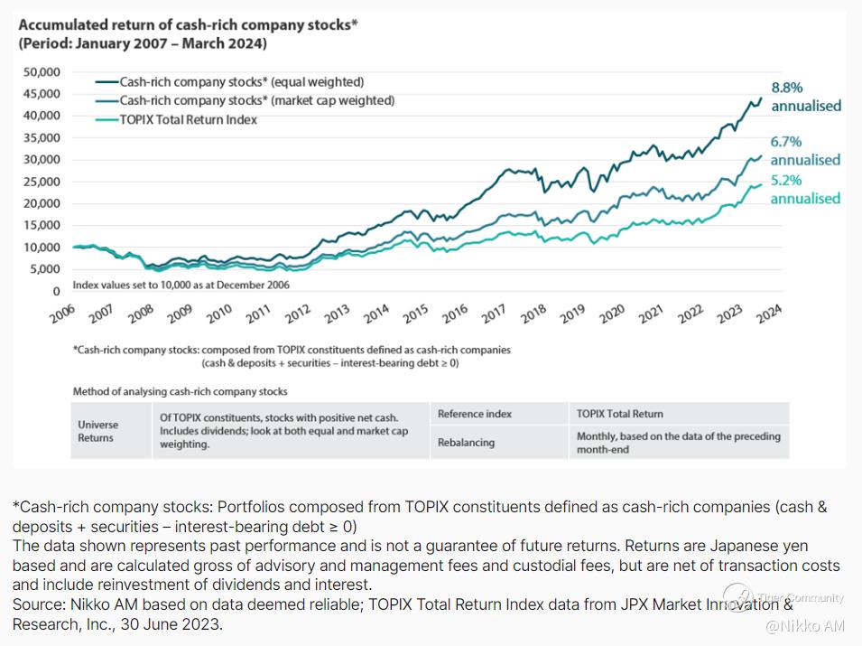 Japan, a nation of “cash-rich” companies, is undergoing corporate reforms aimed at raising valuation of companies by improving their capital efficiency. This includes leveraging existing corporate savings for shareholder distribution and investing for future growth. The reforms, along with cash-rich companies' historical outperformance and strategic options due to their ample cash holdings, make these firms well worth exploring.