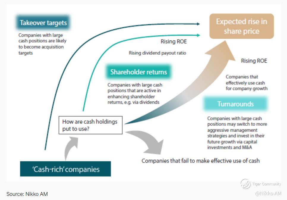 More specifically, there are undervalued cash-rich companies that are expected to improve their ROEs. An opportunity lies in capturing rising beneficiaries of Japan’s revival with more companies starting to improve their capital efficiency amid ongoing corporate governance reforms. Capitalising on the cash-rich companies’ structural reform of corporate governance through ROE improvements. This approach gives the opportunity to leverage corporate actions to improve shareholder returns.
