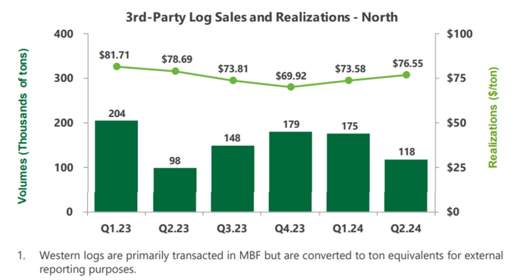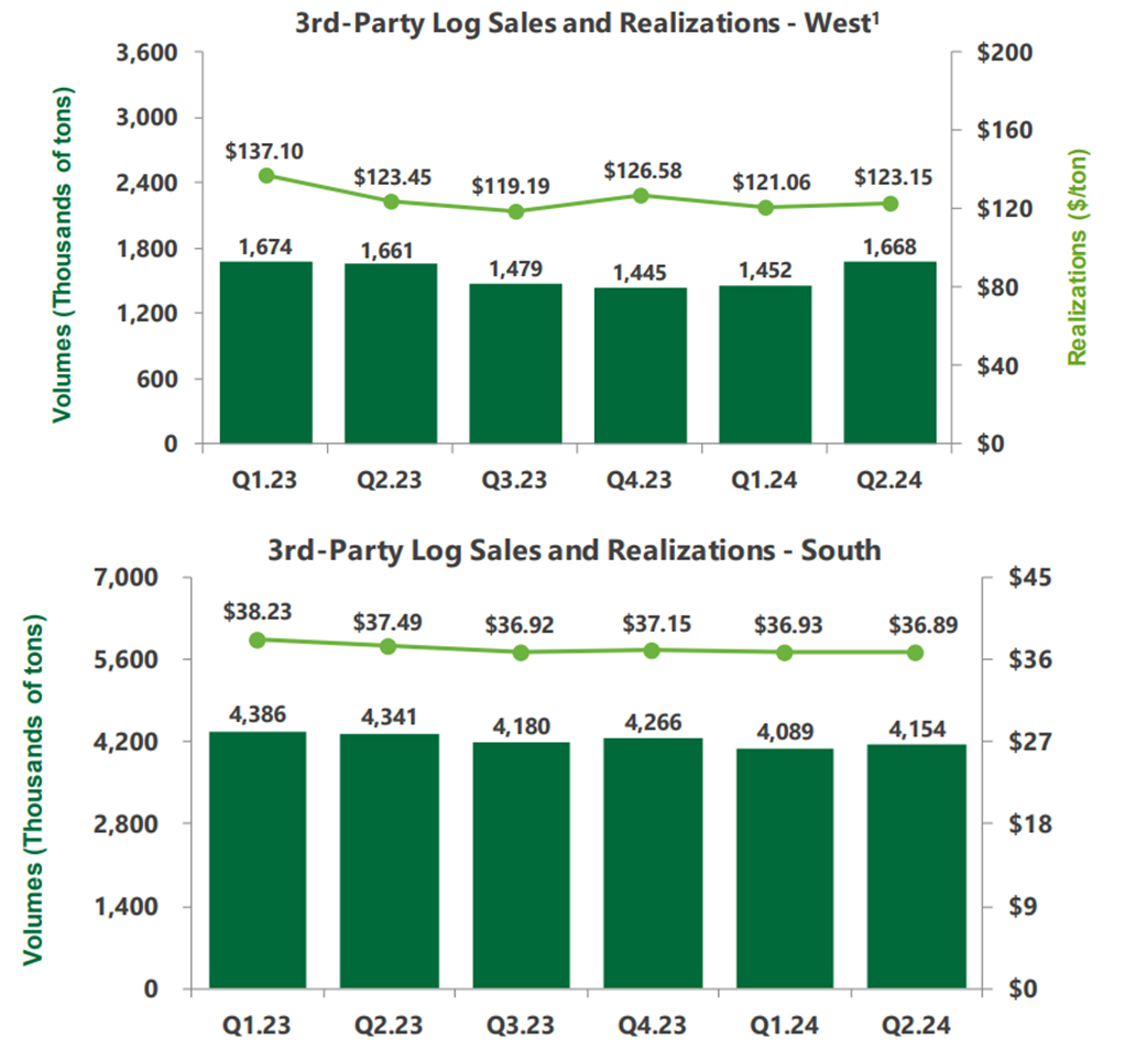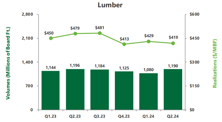 The Wood Products segment represents all milling operations. WY is the second largest board lumber producer in the US, and the #1 engineered wood producer. As of the quarter ending June 2024, WY has 12% operating margin for milling operations despite the large overcapacity present in the US. Sales for board lumber decreased by 2% year over year, with prices falling by 14.3%.