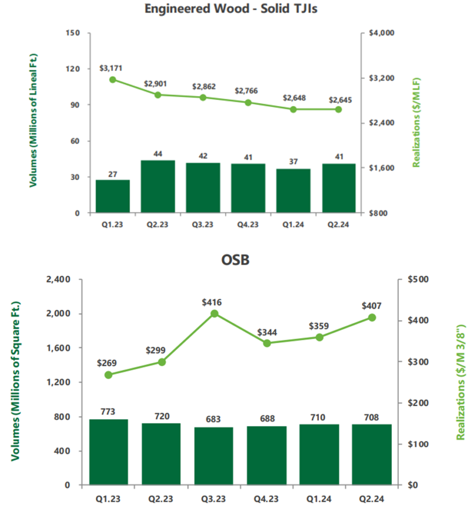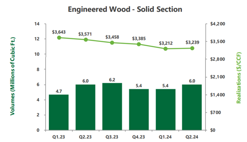 In engineered and particle board products, realized prices experienced a steady decline, with volumes remaining flat.