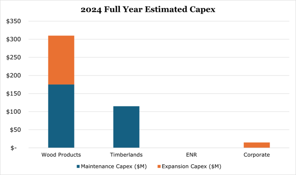 Historically WY spends between $440-$470 million on capex per year, expecting 2024 to end with $440 million in capex. Though, management has stated that it is targeting a small contraction down to $420-440 through 2025. Generally, around 66% of capex spending is utilized for maintenance operations including purchasing more acres to replace depleted timberland assets or buying new equipment in the wood products segment. The largest component of expansionary spending in 2024 is continuing a large sawmill modernization project to support continued footprint expansion in the south.