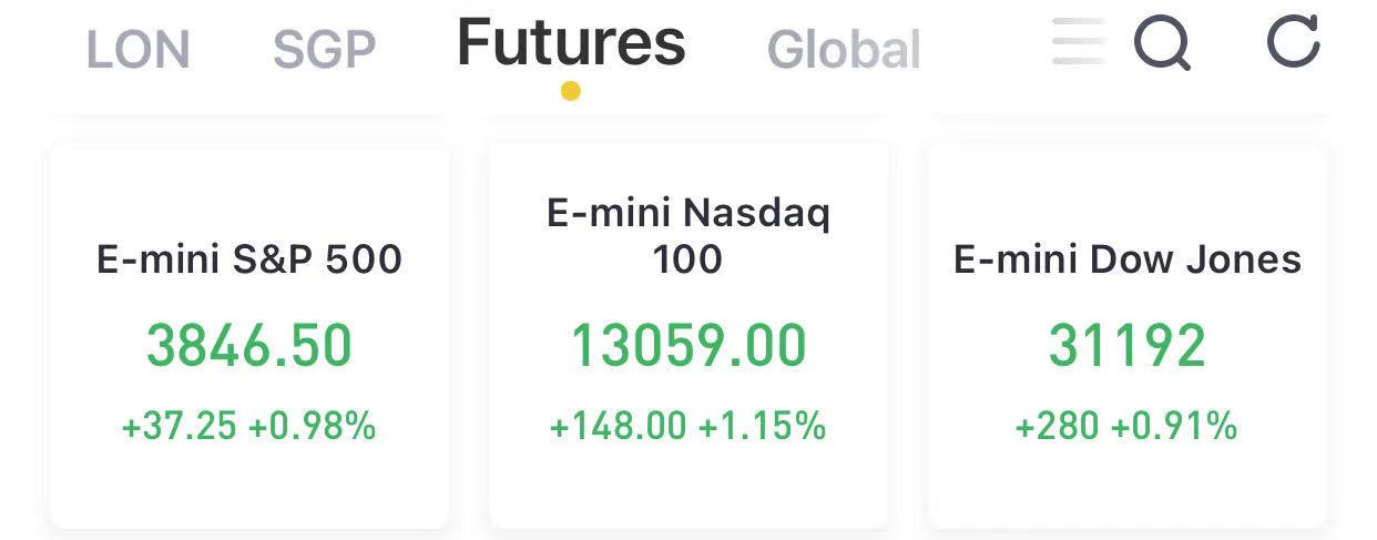 Dow Jones Industrial Average futures were up more than 200 points,or 0.91%, while S&P 500 futures gained nearly 1%, Nasdaq-100 futures gained more than 1%. Meanwhile, the 10-year Treasury note yield dipped to 1.386% early in Sunday trading, then slowly regained ground, last at 1.412%. Bond prices move inversely to yields.