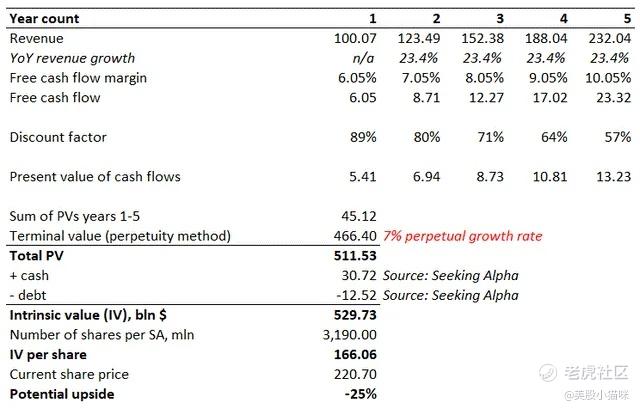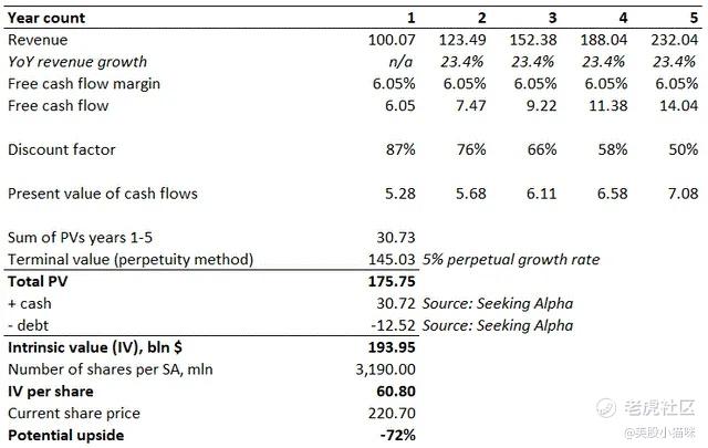 基於這些假設,特斯拉的內在價值每股約爲61美元,遠低於目前的股價。即使在更激進的假設下,特斯拉仍然被高估了約25%。