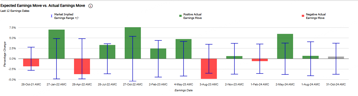 Over the past 12 quarters, the options market overestimated Apple stock's post-earnings price movement 58% of the time. The anticipated move after earnings averaged ±4.0%, while the actual average move was 3.6% (in absolute terms).