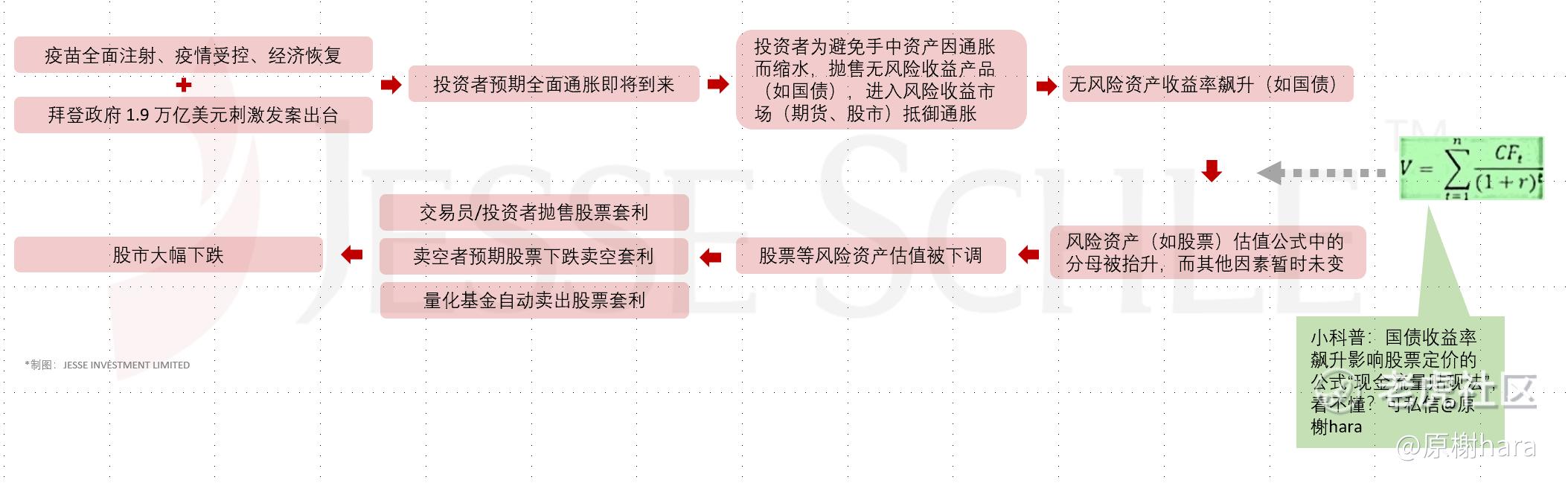 先說結論:即美國10年期國債收益率的大幅提升,導致全球資本市場的風險資產收益定價發生變化,推動目前估值高位的股票價格下移,最終導致股市下跌,畫個邏輯圖吧,讓元寶們更容易理解: