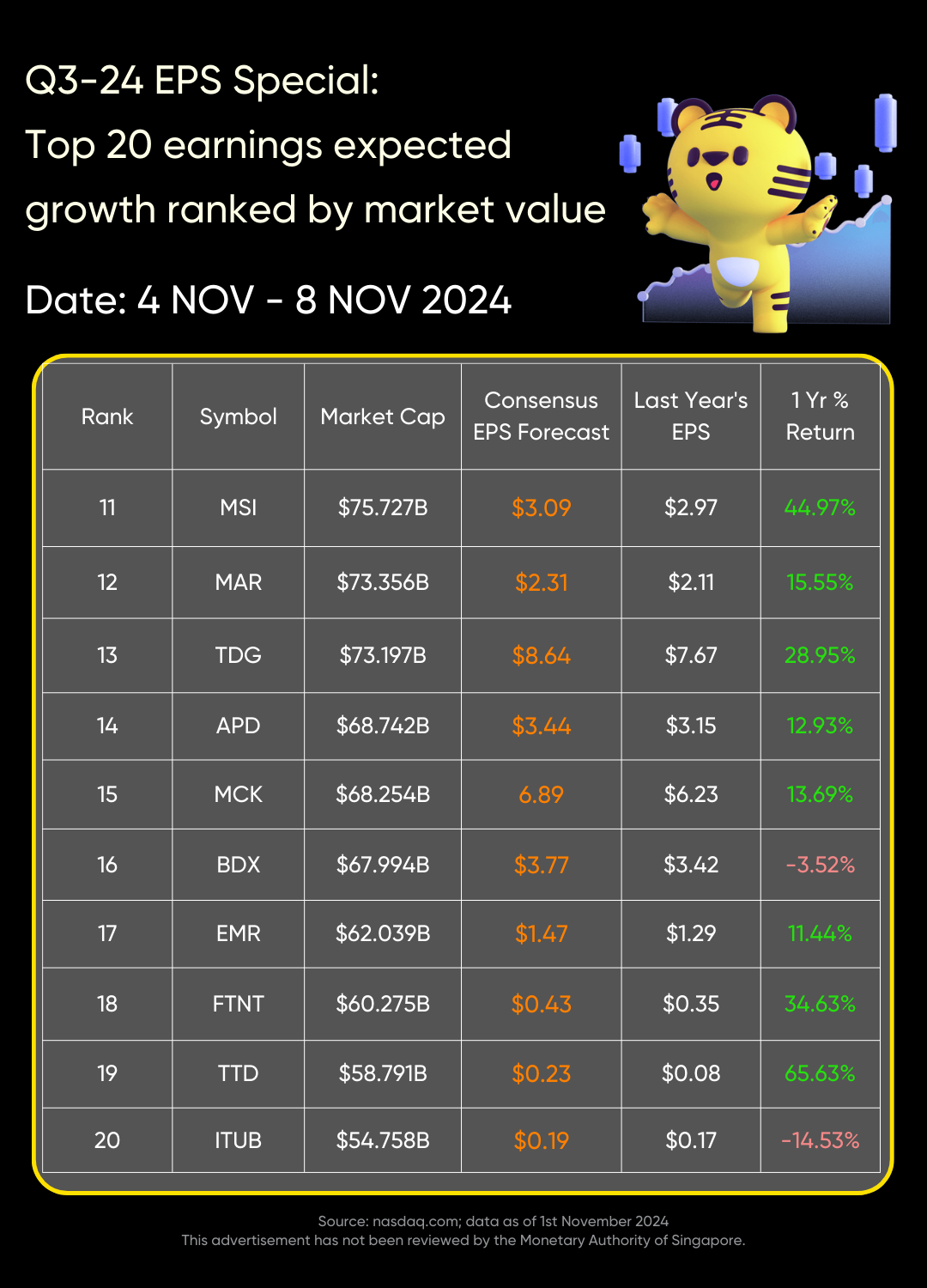 On November 4 to November 8, $Novo-Nordisk A/S(NVO)$ , $Qualcomm(QCOM)$ , $Arista Networks(ANET)$ , $MercadoLibre(MELI)$ , $Palantir Technologies Inc.(PLTR)$ , $Ferrari NV(RACE)$ , $Zoetis(ZTS)$ , $Constellation Energy Corp(CEG)$ , $Apollo Global Management LLC(APO)$ , $Motorola Solutions(MSI)$ , $TransDigm(TDG)$ , $Air Products & Chemicals(APD)$ , $McKesson(MCK)$ , $Becton Dickinson(BDX)$ , $Emerson(EMR)$ , $Fortinet(FTNT)$ and $Itau Unibanco Holding SA(ITUB)$ are releasing their earnings, and consensus earnings per share forecasts are higher than data from the same period last year.